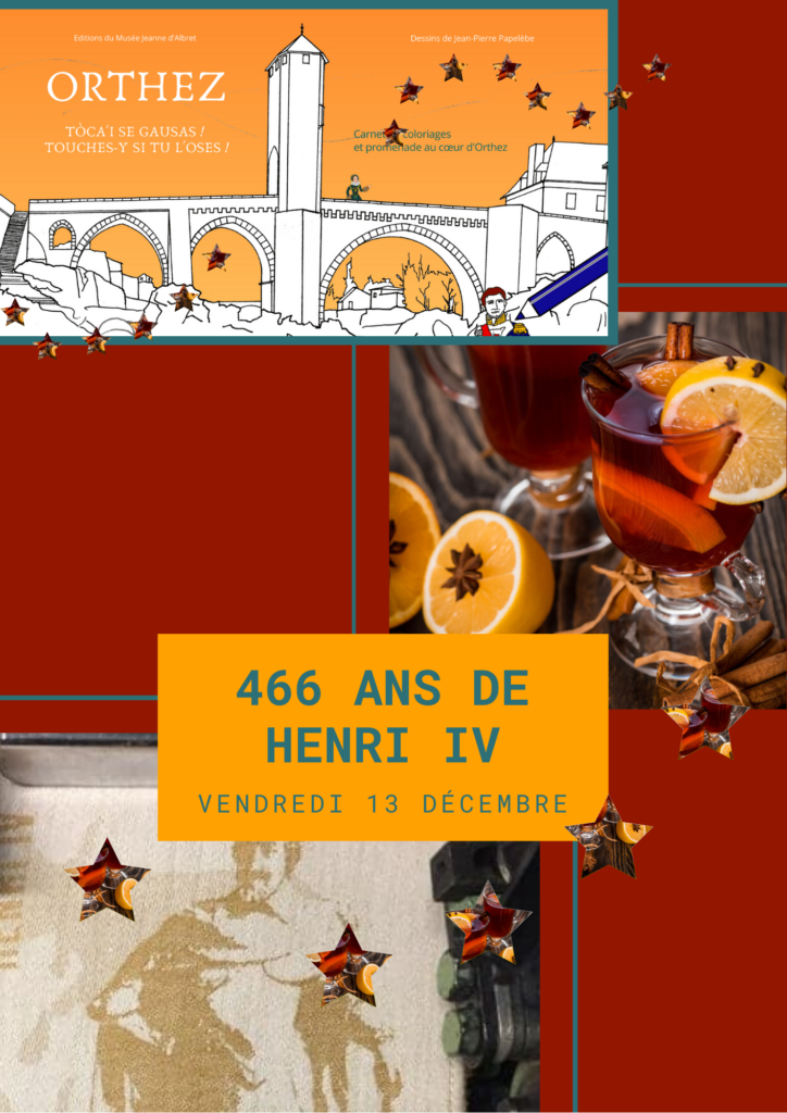 A l'occasion de l'anniversaire de la naissance d'Henri IV, le musée propose une après-midi conviviale autour d'un vin chaud. Programme : > 16h - Echanges avec Dénes Harai à propos de son dernier ouvrage Au nom de la reine ! Henri de Navarre, lieutenant général de Jeanne d'Albret. > 17h - 18h30 - Présentation des nouvelles créations et des projets du musée pour l'année à venir : …